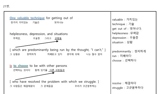이번 지문은 긍정적인 사람들과의 관계를 통해 무력감과 우울을 극복하는 방법을 다루고 있어요.