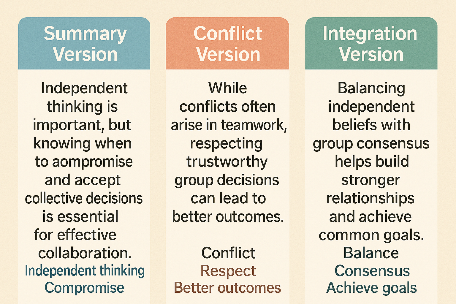 Balancing / independent beliefs / with group consensus / helps / build / stronger relationships / and achieve / common goals.